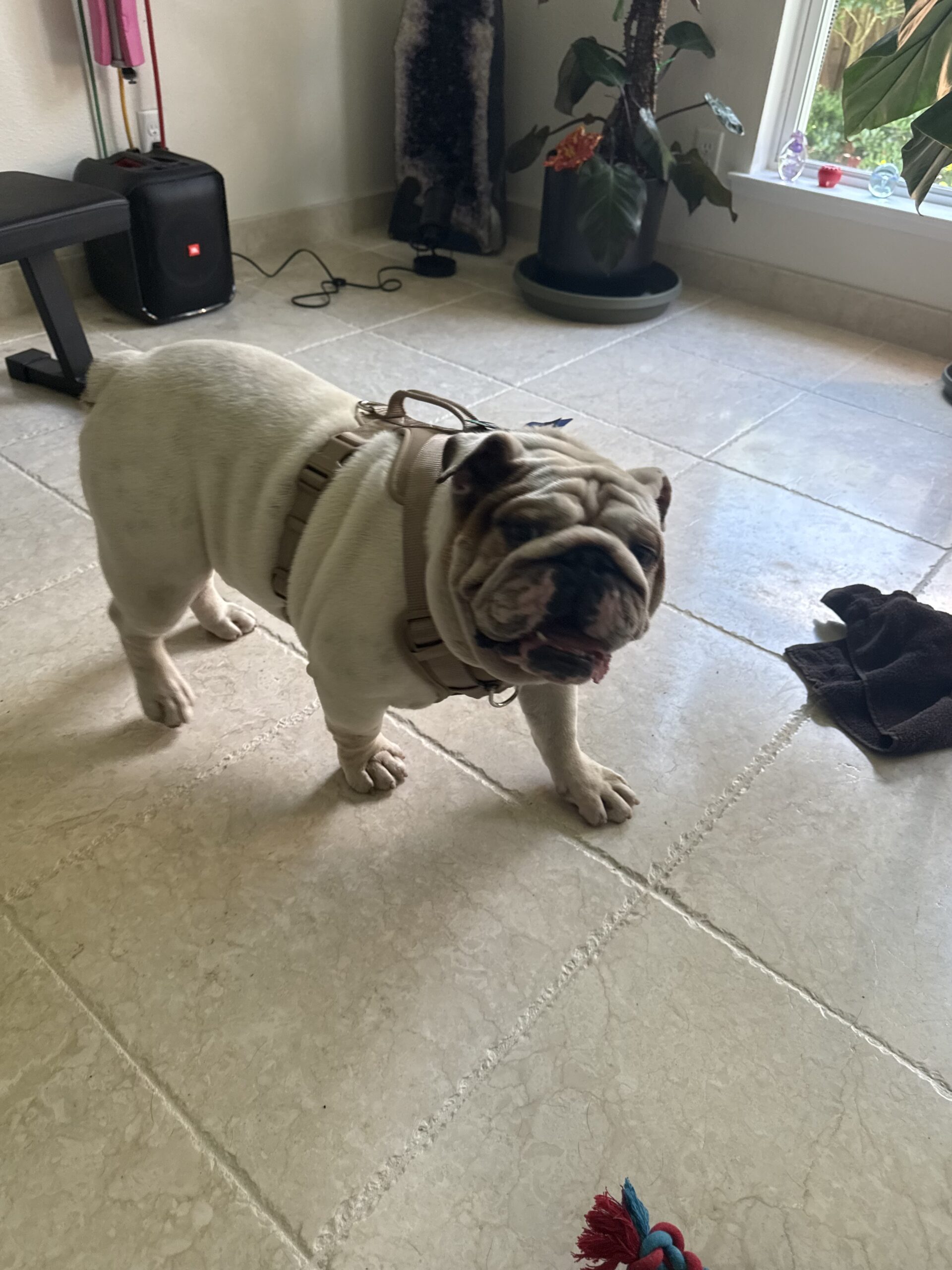 He is not fully potty trained, has peed inside twice, but when we take him out often he doesn't have accidents. He has peed on our patio, seems not to prefer grass, but when walked on a leash on grass will use the bathroom there. He likes to play and roam the house, has not shown destructive behaviors. He was snippy at first when I tried to redirect his movement or restrain him, especially when my hands were near face, but never bit me, only snips. He would also cower after he snipped or cower when my hands moved towards his face, possible abuse, something like being smacked in the face or head for discipline perhaps. After a few days of giving him love and patience, he has not been snippy or cowered as much. He loves to be with our other dogs, though he does try to mount. He tried to mount our older dog who was a foster, that dog snipped at him and he took it well. He backed down and did not become aggressive or snip back (probably needs more time socializing with other dogs, maybe was used for breeding and thats it). He is overzealous and energetic with our dogs so will need some training to be well behaved with other dogs, but again is not aggressive, just curious and excited. Vet said he could be 1-2 years of age. He is a sweet and loving dog that when allowed to roam free is generally well behaved, just need more extensive potty training, but with frequent outside bathroom breaks, has not had accidents. Takes kennel well at night after a few minutes or crying or noises, but still prefers to be free. Loves soft toys and loves to discover the house. His breathing can be bad, the Vet said his nostrils are good, 6 out of 9, but has the thick or extra tongue that causes issues with breathing. He does breathe heavy after 10 mins of activity, but once he calms down, he improves. However, he is very noisy most of the time. He was negative for heartworm, parvo, and parasites, and we have updated him on all vaccines. He seems to do well with all new people. He will cry or bark when put in kennel sometimes as he prefers to be free, but again will calm down if he doesn't hear our other dogs or noises. We keep him free most of the time, but sometimes he has to be put away.