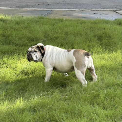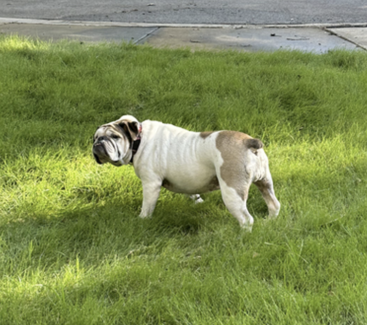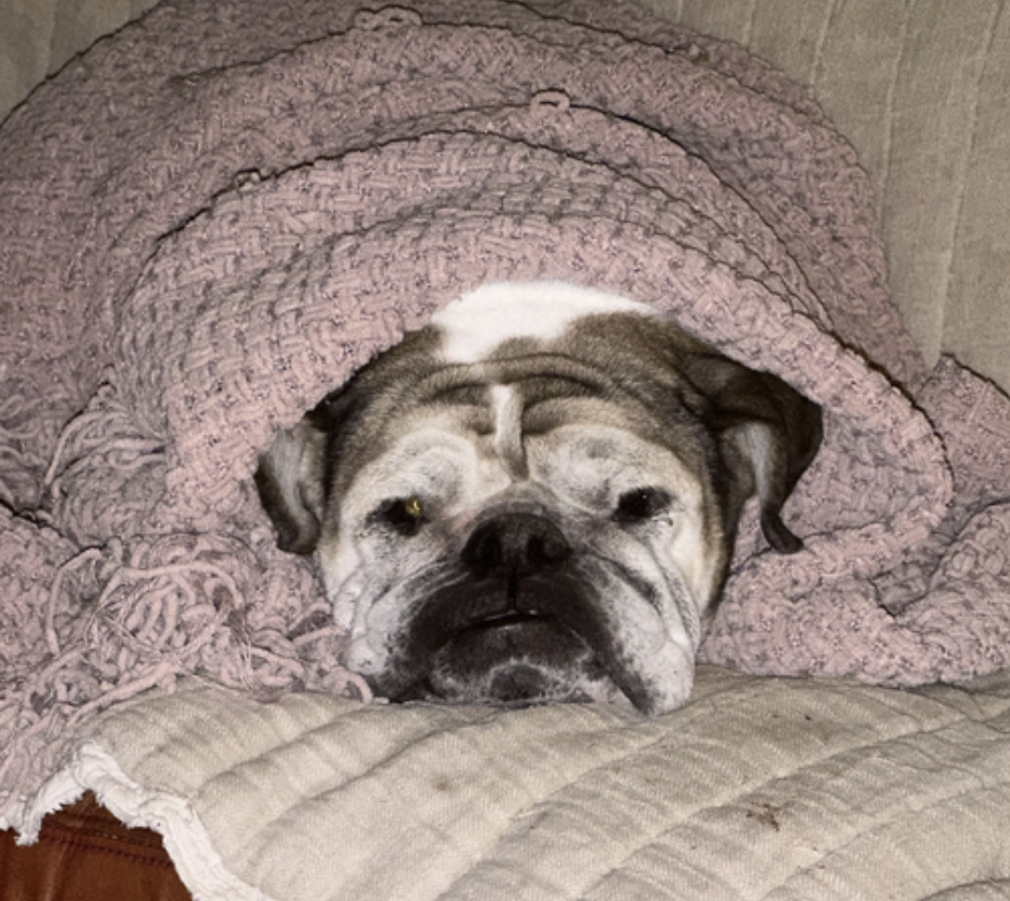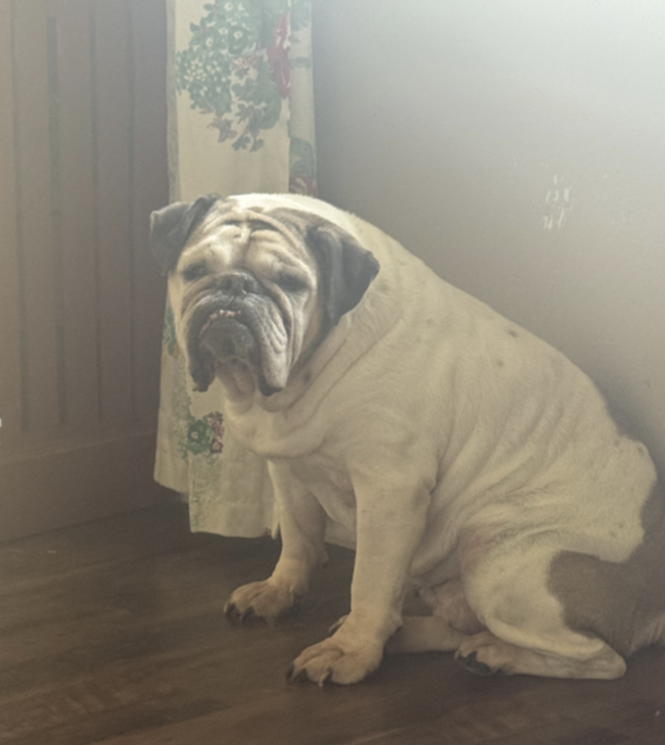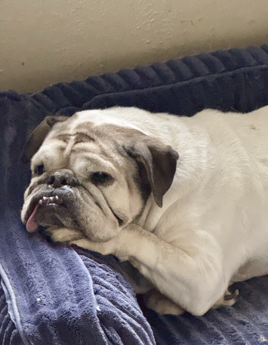 Izzy is a typical senior bulldog (IYKYK), happy to coexist with other critters, and ready to be some lucky person's constant companion at home :).
