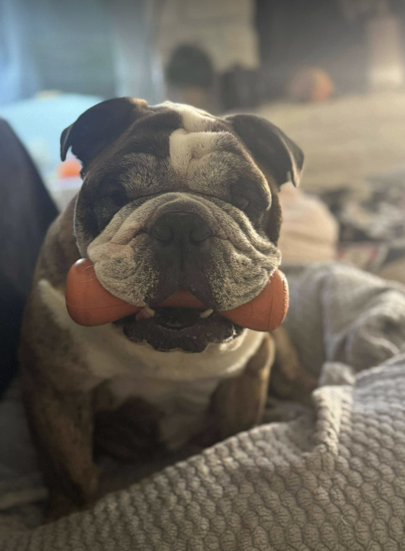 He is soaking up all the love his fabulous foster has to give, and, as a bonus, he is RIDICULOUSLY attached to walking around with a bene-bone in his mouth.